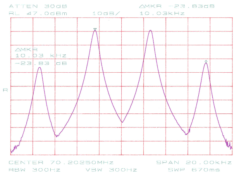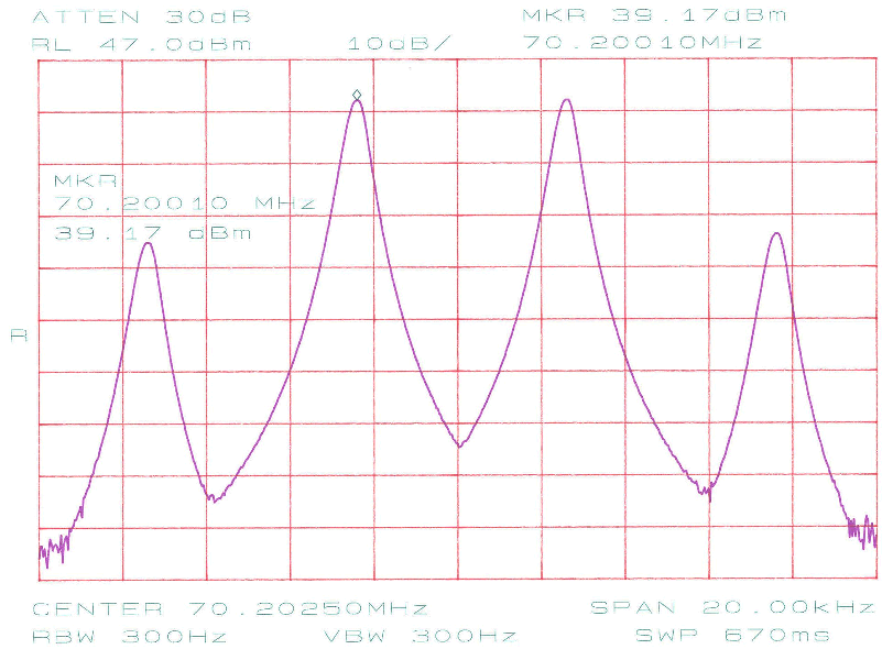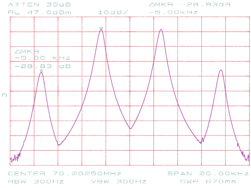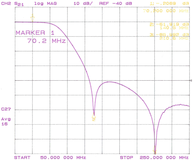 Selve tuningen af lavpasfiltret foregår ved at klemme eller udvide L3 og L4, men gør det kun på en af gangen. På L3 justeres til dykket falder på 210 MHz og tilsvarende for L4 på 140 MHz. Den uundgåelige dæmpning i pasbåndet bliver ikke synderligt påvirket af tuningen af L3 og L4. Skulle dette være tilfældet, så er der noget helt andet galt i konstruktionen. Har du ikke mulighed for at tune filtret på en spektrumanalysator så brug en lille men kendt effekt på 70 MHz og mål den både før og efter lavpasfiltret. For at filtret ikke skal være helt ved siden af bør der maksimalt forsvinde 10% af effekten i filtret.