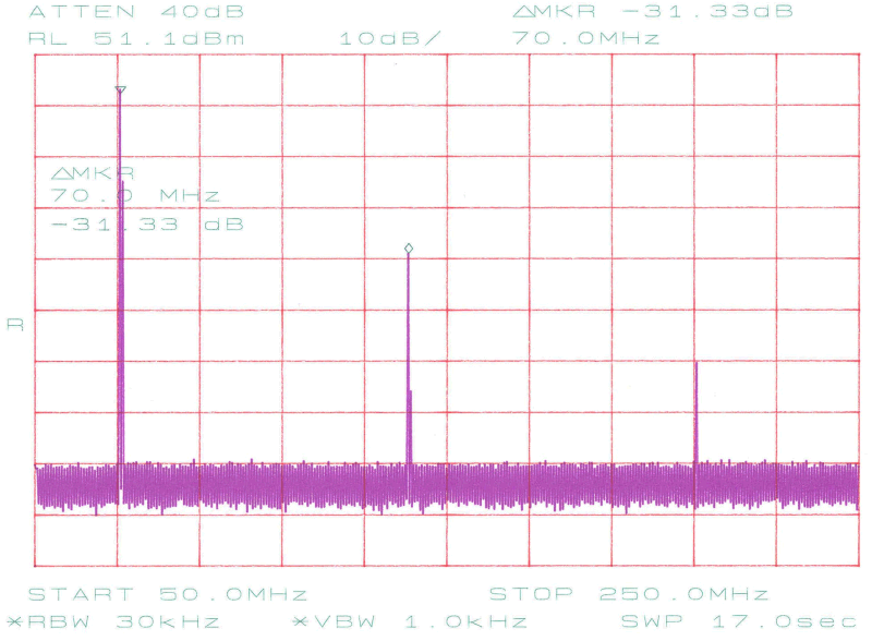 Intermodulation ved en hvilestrøm IDDQ = 1,5 A og POut = 33 W PEP. Tredie-ordens IMD er dæmpet 26 dB.