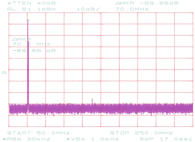 Spurius ud af et ufiltreret powermodul, ved en hvilestrøm IDDQ = 1,5 A og POut = 25 W.
