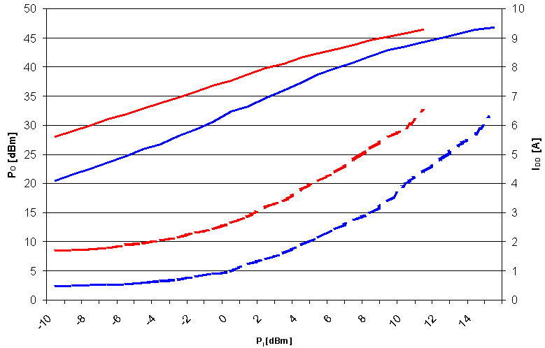 Udgangseffekten (POut) og drainstrøm (IDD) som funktion af indgangseffekten (PIn). De fuldt optrukne linier er udgangseffekten. De røde linier for IDDQ = 1,5 A og blå er for IDDQ = 500 mA.