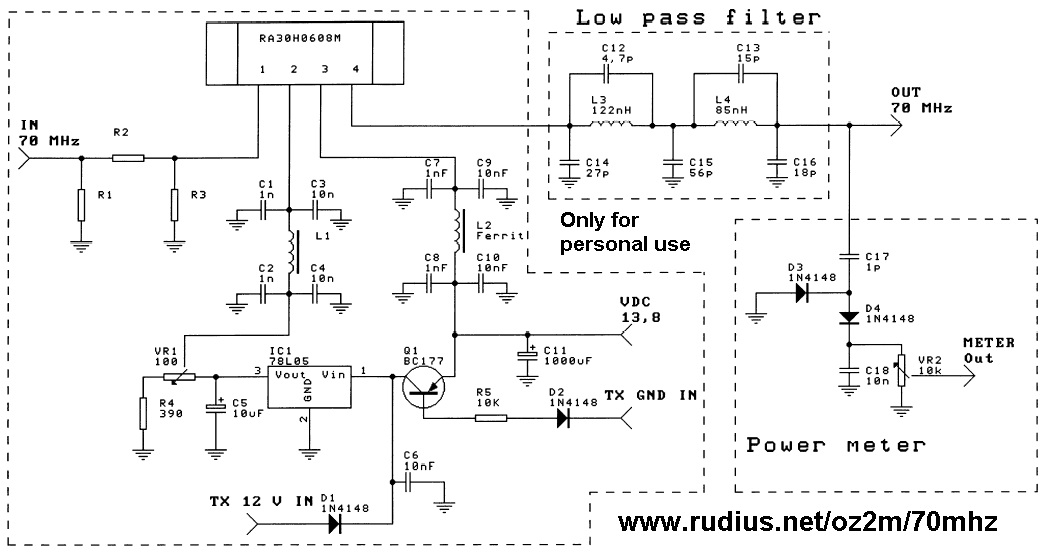 Dæmpeledet på indgangen (R1-3) kan være nødvendigt at bruge hvis styreeffekten er for høj. På udgangen er monteret et elliptisk lavpasfilter (C12-16, L3-4) hvis første dyk er designet til at være på den anden-harmoniske omkring 140 MHz og andet dyk på 210 MHz svarende til den tredje-harmoniske.