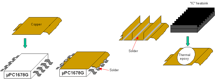 BUT I had on my table IC746PRO S/N 3422 with factory installed these diodes and driver IC was DEAD. And components on static electricity path are still healthy. Construction problem is somewhere else. Author leaves this IC under power also in receive state, which main mistake is. IC has idling current about 50mA and produce heat in receive regime. In radio transit regime „eat“ higher current and also higher temperature. A now we are in construction problem. Producer of this IC uPC1678 in application note describe, how big must be minimal area of copper on PCB for good cooling. This IC is cooled only through legs!!!!! And this was by ICOM absolutely underestimated, beside minimal area of copper with dense area of connecting hole about 6cm sq. In IC74X device are only about 1cm sq. of flat and thereby also cooler. This is reason why this IC heats till overheat deal. From IC 74X production start I replaced about 20 this IC, and this is reason why I start to search where is problem. Problem can be solved by adding some cool wing connected to device chassis, but in possible mounting place body is not flat, but rounded. Or is possible to think about switching off this IC in receive mode.