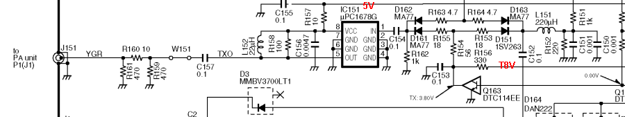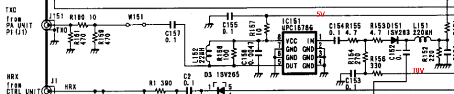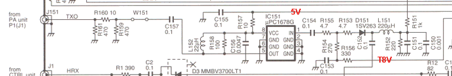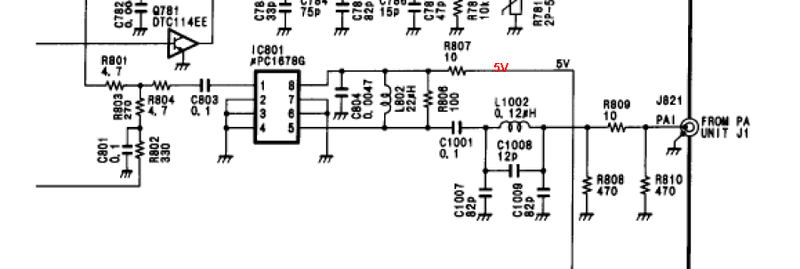 As can be seen in the above the IC801, µPC1678G, is permanently connected to the 5 V line and the topology is identical to the one of found in the IC-746 and IC-746PRO.