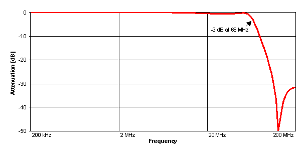 The response curve of the lowpass filter shows a -3 dB cut off at 66 MHz thus the filter cleans up signals relevant for the IC-756PROs. If a similar idea should be implemented in the IC-746PRO component values would have to be changed to allow 144 MHz to pass. But I find it hard to believe that the lowpass filter has anything to do with the life and dead of the µPC1678G.